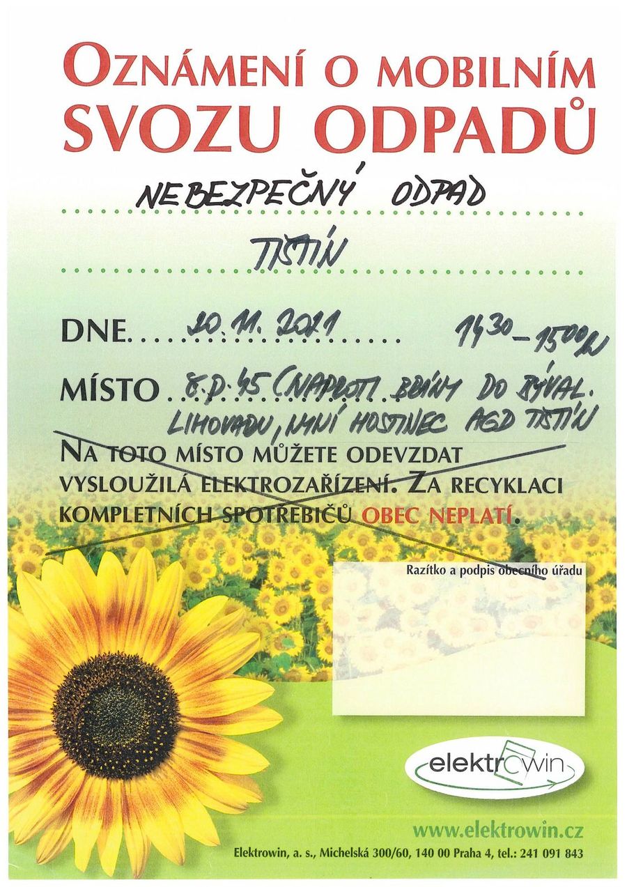 - akumulátory, plechovky od barev, barvy a ředidla, zářivky a výbojky, pesticidy, fotochemikálie, léky, lepidla, desinfekční prostředky, čistící prostředky, zaolejované hadry, nádoby se zbytky chemikálií, vyjetý motorový a převodový olej.