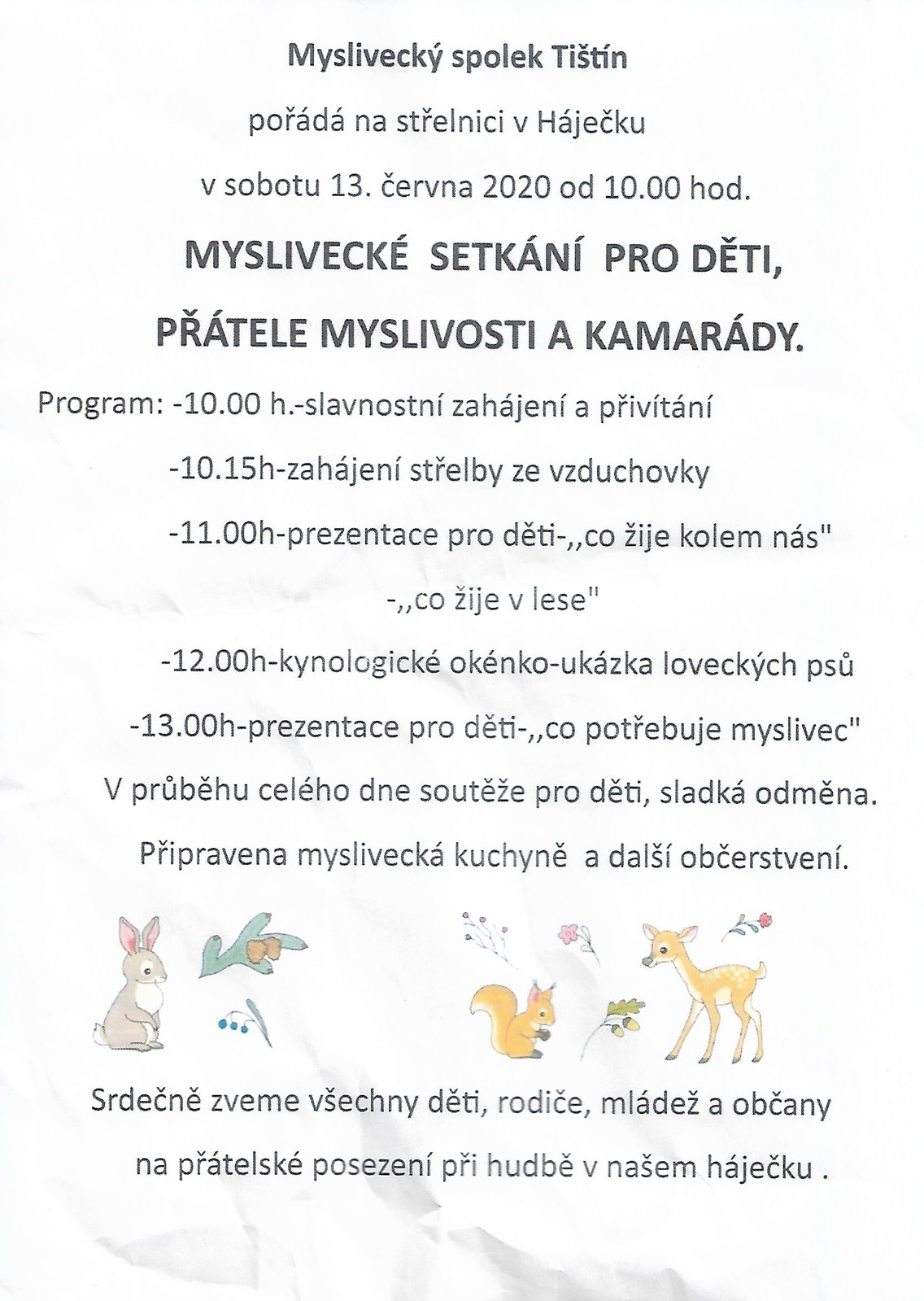 Úvod > Obec > Aktuality > Myslivecké setkání pro děti,přátele myslivosti a kamarády. V sobotu 13.6.2020od 10hod.