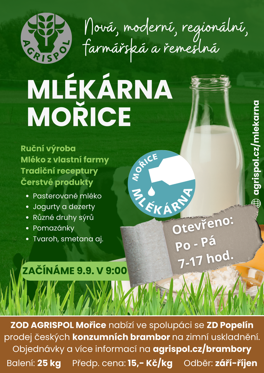 Mlékárna Mořice informuje o zahájení prodeje vlastních mléčných výrobků v nové prodejně v areálu farmy ZOD Agrispol Mořice od úterý 9.9. od 9 hodin .