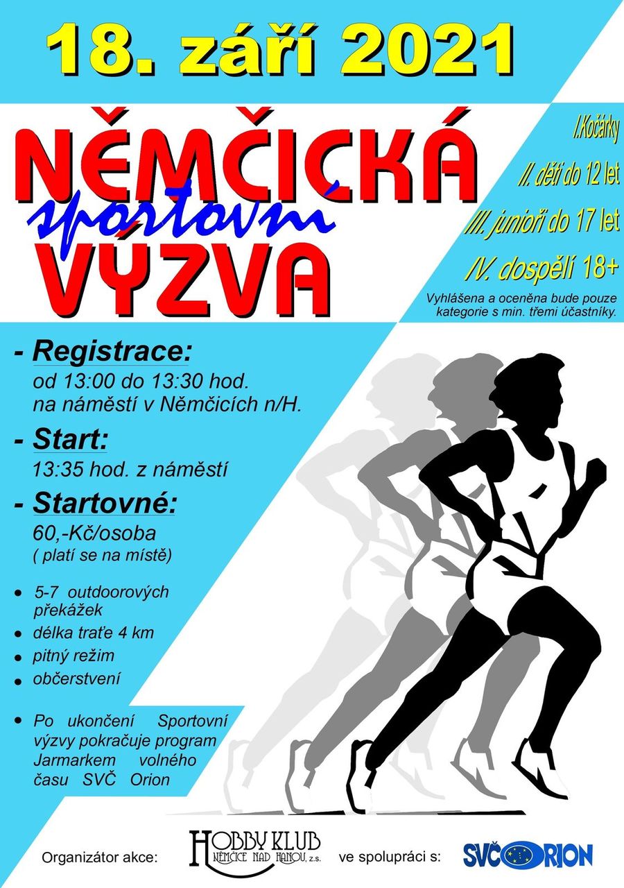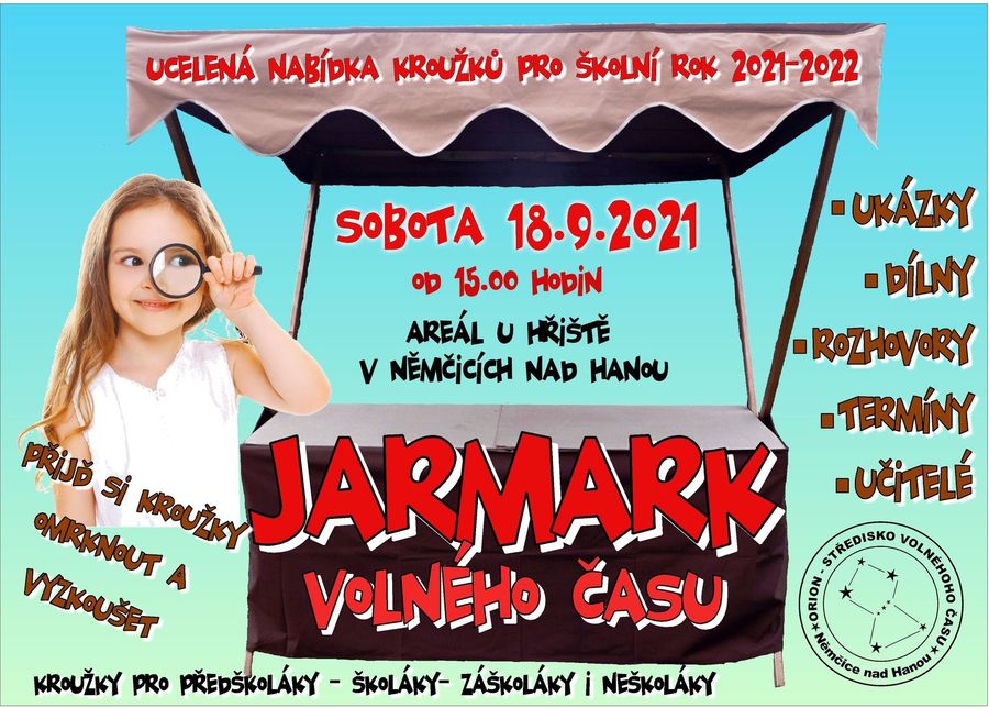 ORION – Středisko volného času oznamuje, že od 1.9.2021 je možné se přihlásit do zájmových kroužků. Orion nabízí kroužky pro děti, mládež i dospělé zájemce. Podrobnou nabídku najdete na webu www.svcorion.cz nebo osobně v kanceláři ORIONU v Němčicích nad Hanou. Všechny kroužky si můžete vyzkoušet a vidět v sobotu 18.9., kdy ORION pořádá Jarmark volného času na ploše za fotbalovým hřištěm v Němčicích nad Hanou. Zápisy jsou možné do konce října a nebo do naplnění kapacity jednotlivých kroužků. Rádi vám s výběrem poradíme a těšíme se na vás.