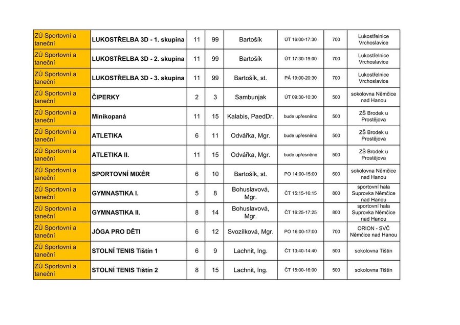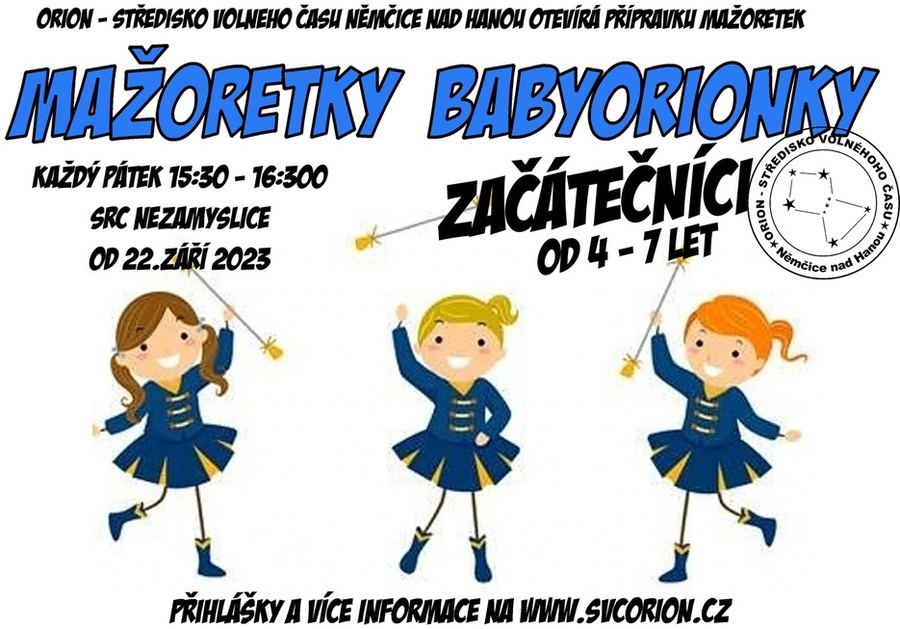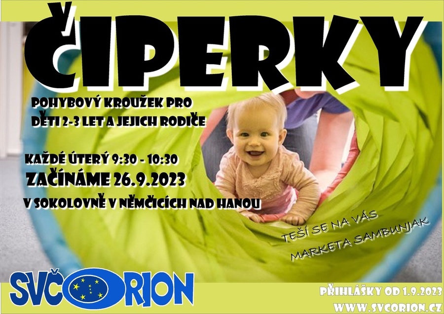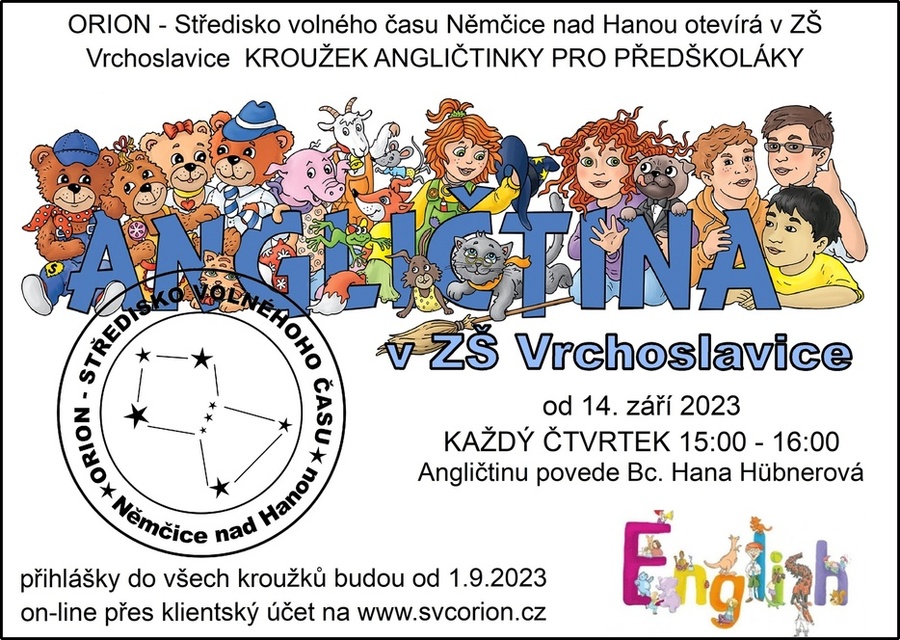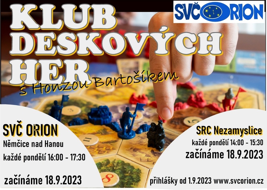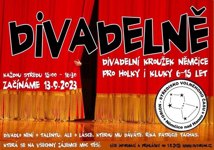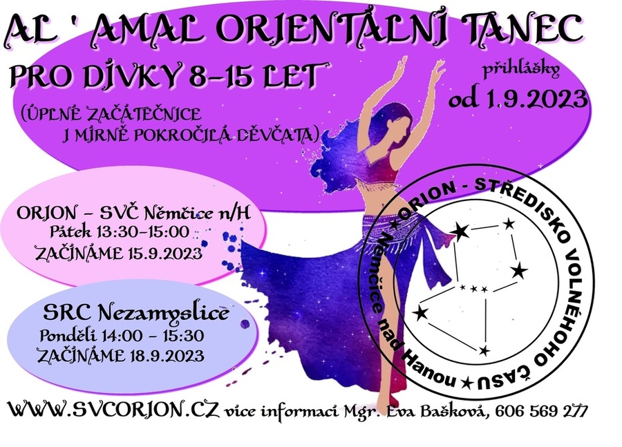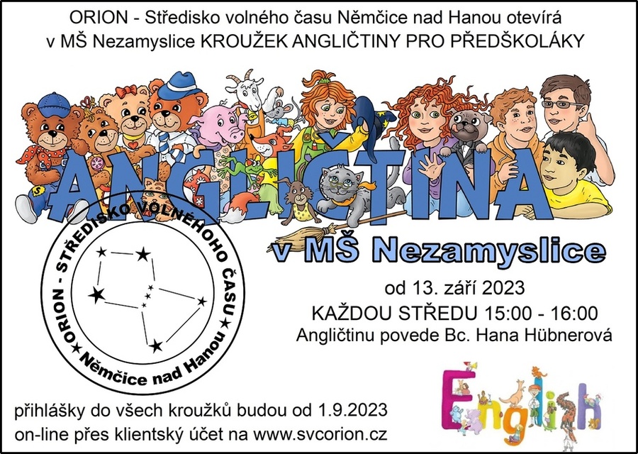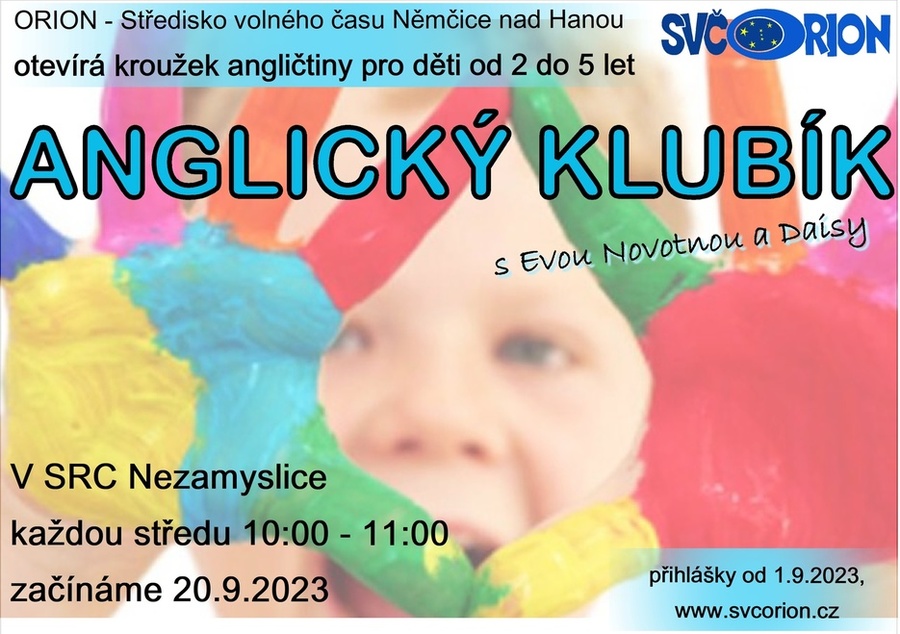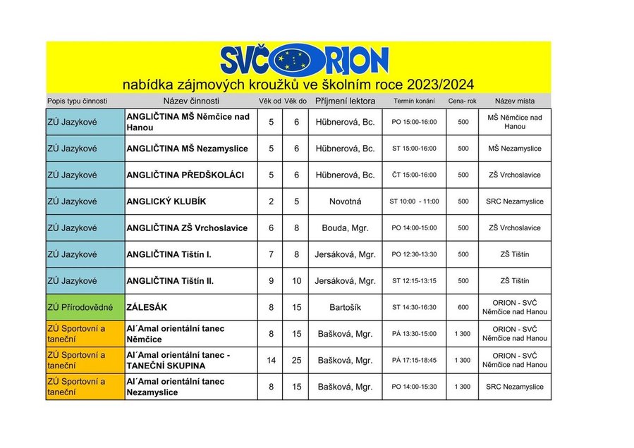 ORION - Středisko volného času Němčice nad Hanou otevírá pestrou nabídku zájmových kroužků pro děti, mládež i dospělé zájemce v novém školním roce. V nabídce je mnoho novinek a také nová místa,kde kroužky probíhají. Ucelenou nabídku najdete na webu www.svcorion.cz nebo v kanceláři ORIONU v Němčicích nad Hanou. Přihlásit se můžete on-line nebo osobně. Rádi vám také s výběrem kroužku pro vás nebo vaše dítě poradíme. Více informací získáte také na telefonu 606 569 277. ORION je pro vás partnerem ve vašem volném čase.