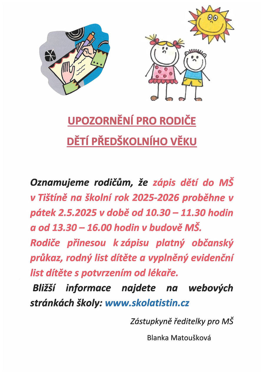 Úvod > Obec > Aktuality > Zápis dětí do MŠ Tištín
