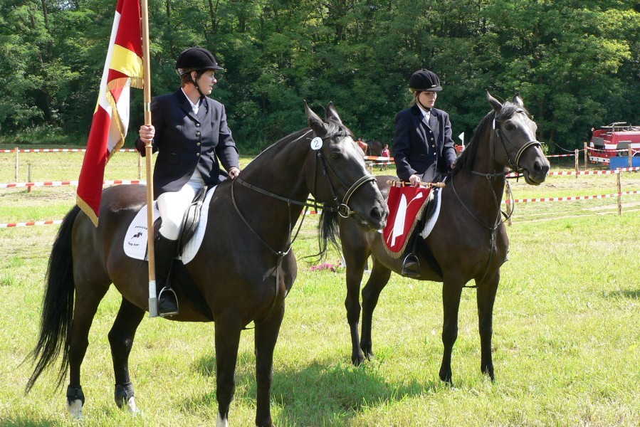 Slavnostní zahájení proběhlo v 10 hodin, kdy do kolbiště vjely na koních dvě členky našeho JK – Lenka Kubíková na Frolce a Jana Adamčíková na Centě a přivezly obecní symboly – obecní prapor a znak.