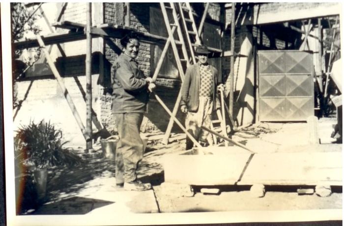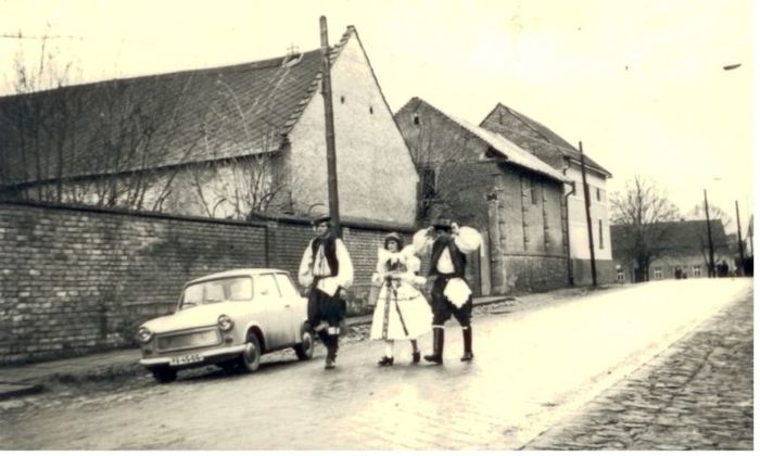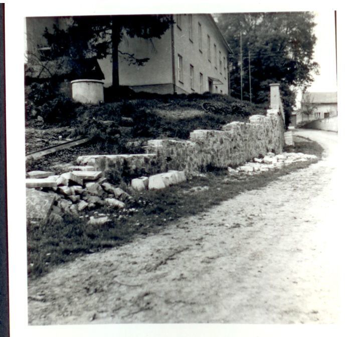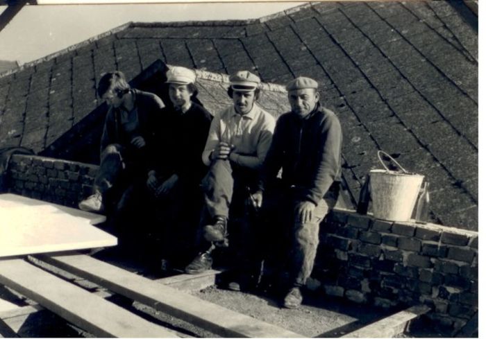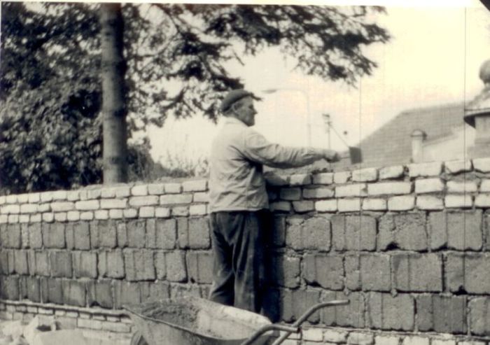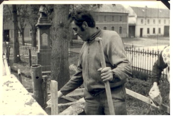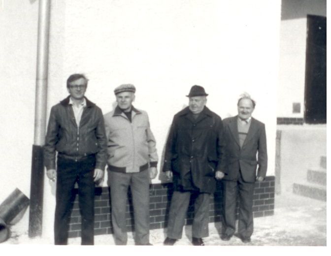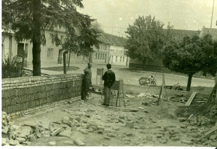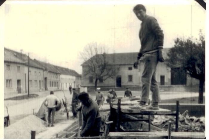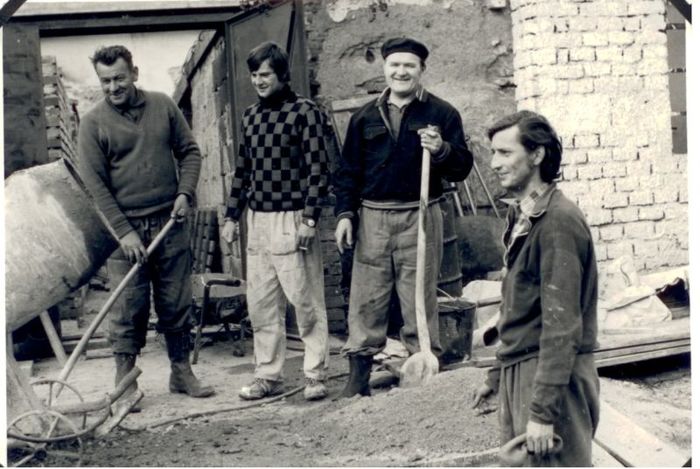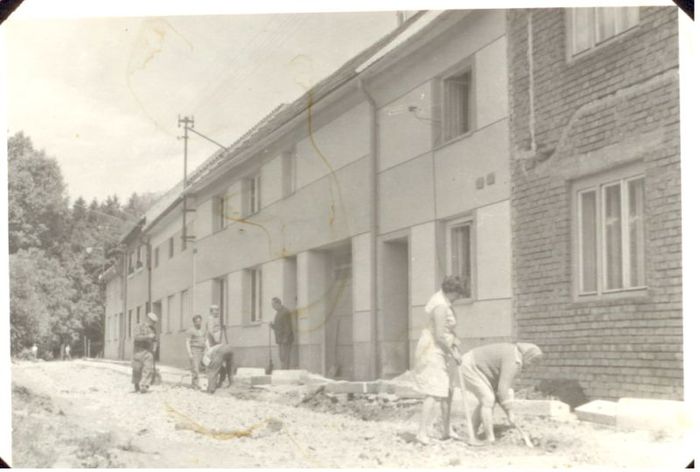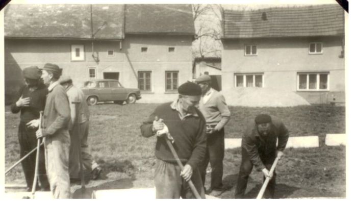 budování chodníku v Trávnické ulici, r. 1972. S.Tichý, O.Raclavský,M.Horňák, J.Horák, A Obruča